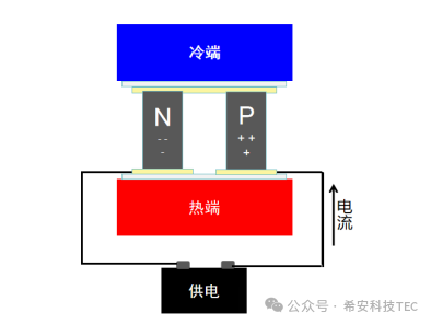 Puslaidininkinio aušinimo principas (Peltier efektas) : kai srovė teka per kontaktinį paviršių tarp p tipo ir n tipo puslaidininkinių medžiagų, nešikliai migruoja ir sugeria šilumą, kad atvėstų (šaltas galas), o šiluma išsiskiria kitoje pusėje (karštas galas).